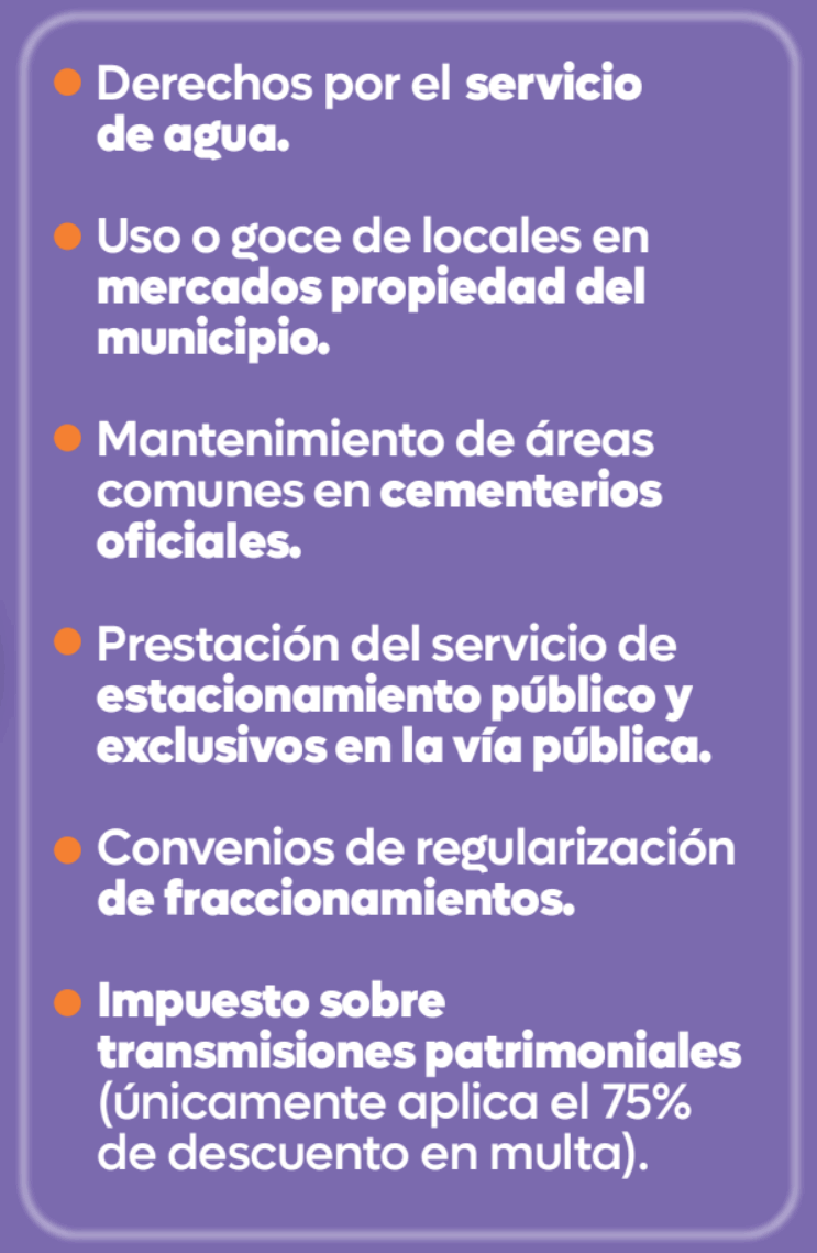* Al pagar la totalidad del adeudo por internet, QR, ventanilla bancaria, tiendas de conveniencia, ChatBot y CoDi, derivado de las siguientes contribuciones: