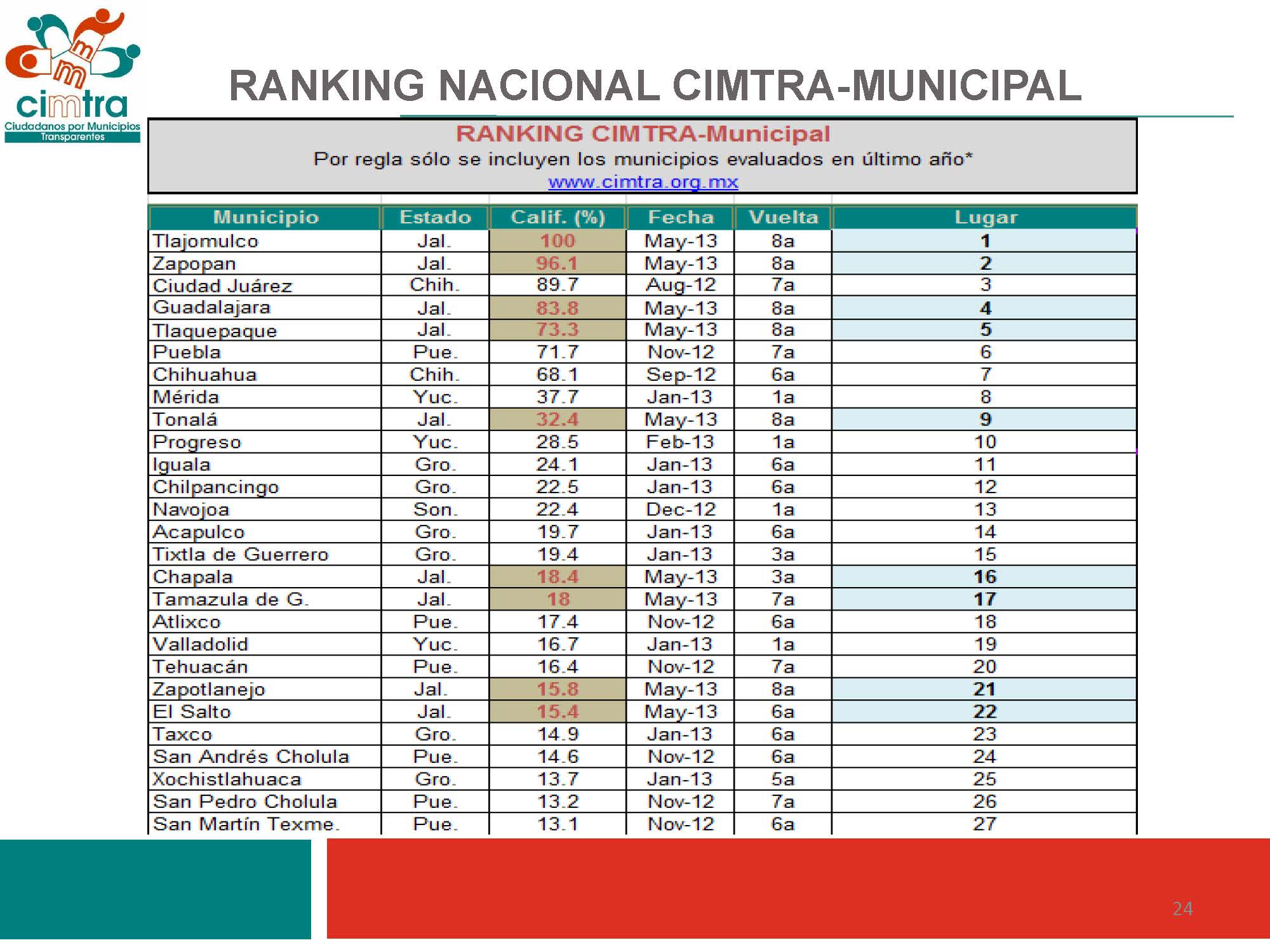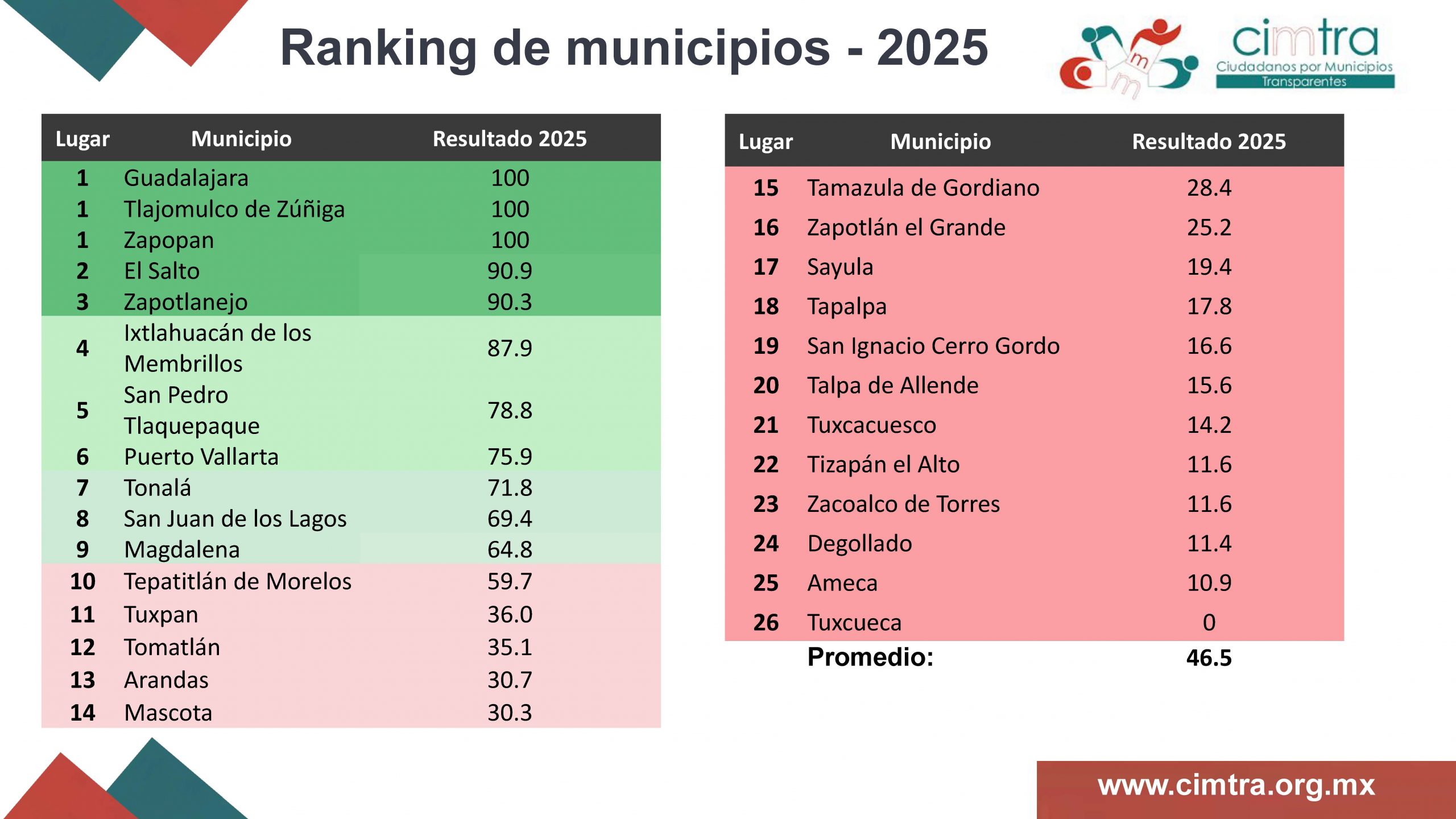 Evaluaciones CIMTRA Ciudadanos por Municipios Transparentes Manual de Aplicación de la herramienta Cimtra-Municipal 2025 Boletín de Prensa CIMTRA Resultados de Evaluación a Municipios de Jalisco 2025 2021 Boletín de Prensa CIMTRA Resultados de Evaluación de Jalisco 2021 2020 Boletín de Prensa CIMTRA Resultados de Evaluación de Jalisco 2020 2019 Boletín de Prensa CIMTRA Resultados de Evaluación de Jalisco 2019 2018 Boletín de Prensa CIMTRA Resultados de Evaluación de Jalisco 2018 2017 Boletín de Prensa CIMTRA Resultado de Evaluación de Jalisco Diciembre 2017 Boletín de Prensa CIMTRA Resultado de Evaluación de Jalisco Marzo 2017 2016 Boletín de Prensa CIMTRA Resultado de Evaluación de Jalisco 2016 2014 Boletín de prensa CIMTRA evaluación publicada en enero 2015, que fue realizada en los meses de noviembre y diciembre 2014 Boletín de prensa CIMTRA evaluación Agosto 2014 2013 Presentación Resultados Evaluación de Transparencia Municipios CIMTRA Junio 2013 2011 Boletín Evaluación Octubre 2011 Boletín Evaluación Marzo 2011